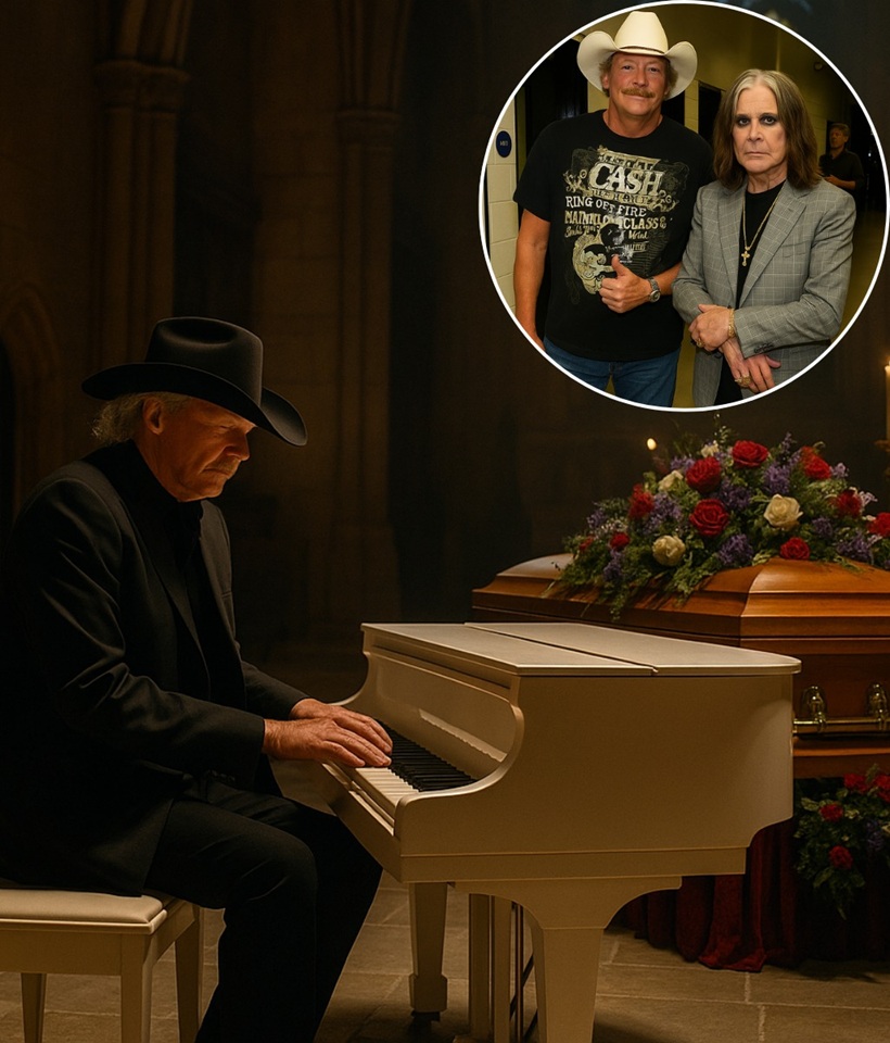 In a moment where legends intersected beyond genre and spotlight, Alan Jackson — country music’s dignified storyteller — walked quietly into a place far removed from honky-tonks and award stages. Dressed in a worn black suit and faded cowboy boots, Jackson approached the altar of a grand church where Ozzy Osbourne’s casket rested beneath a cascade of flowers and stained-glass light. What followed was not a performance, but a prayer — not a concert, but a communion of grief, music, and legacy.