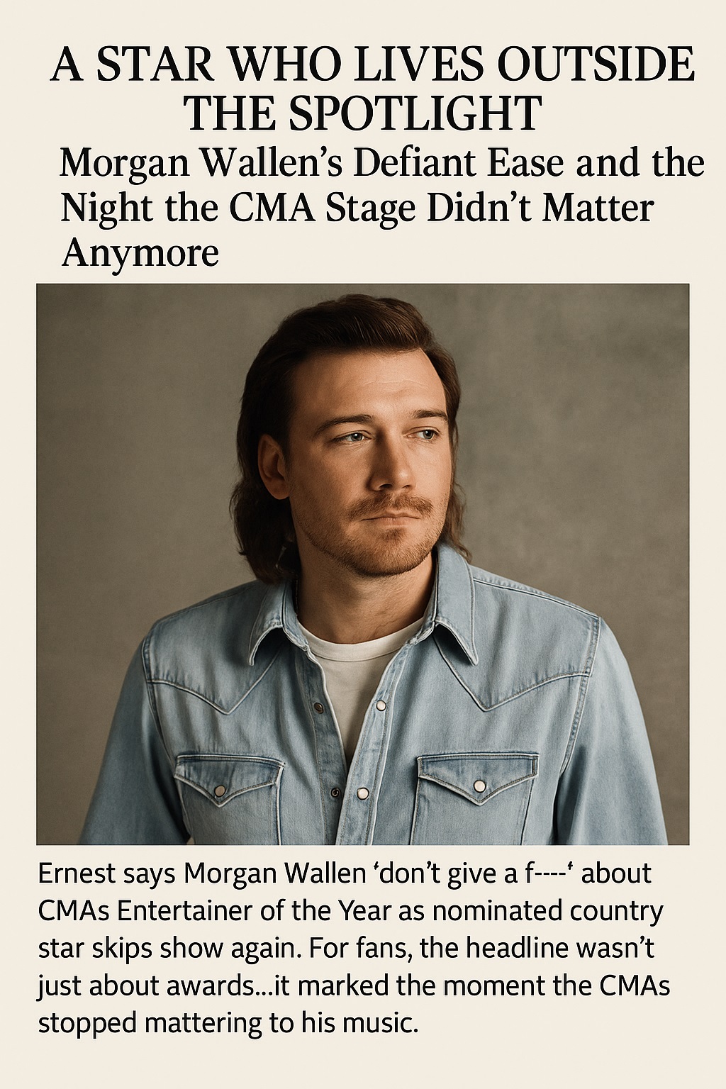 Ernest’s comment, raw as it was, captured something fans have sensed for a long time: Morgan Wallen’s story is no longer tied to the institutions that once controlled country music’s narrative. His success lives in parking-lot tailgates, in packed stadiums, in playlists that never leave repeat mode, and in the voices of millions singing his lyrics back to him. And as long as that continues, as long as the people keep choosing him with their time, money, and hearts, then whether or not he stands on the CMA stage becomes a footnote — not the headline.