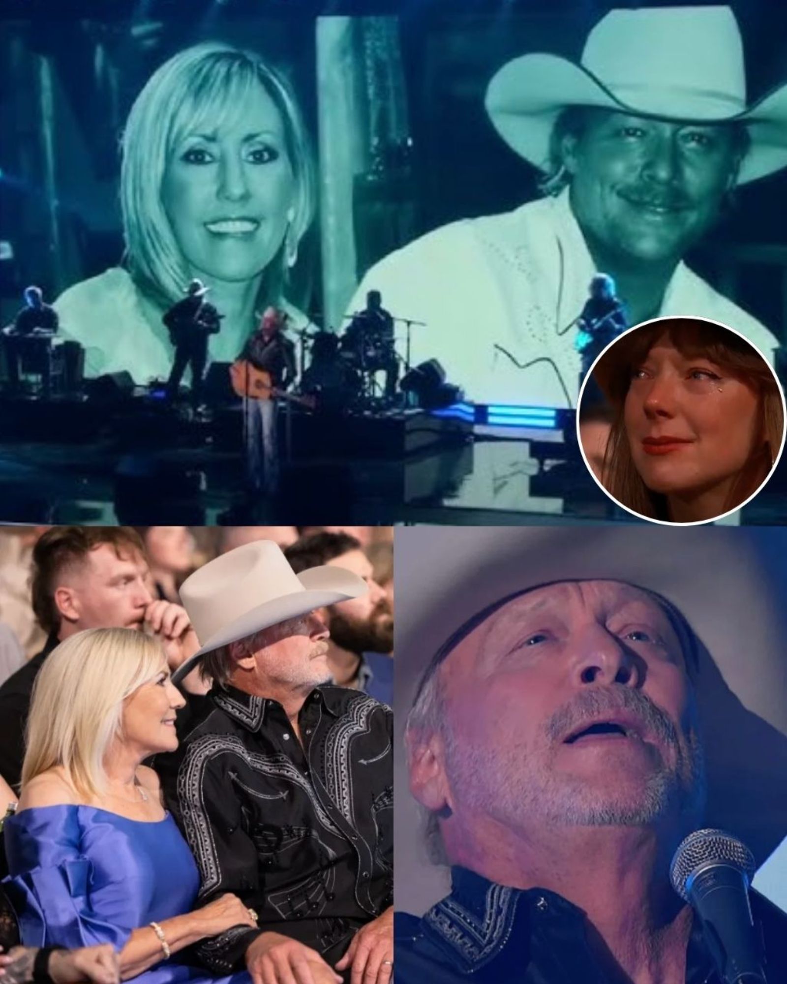 Under the soft glow of a blue spotlight, Alan performed “Remember When” not as a chart-topping hit but as a personal letter to his wife, Denise, and to the life they built together. Behind him, home videos flickered—snapshots of their marriage, their family, and the quiet milestones that defined his journey. Each lyric became more than words; it was a lived memory, shared with both the woman he loves and the millions of fans who have followed his path for decades.