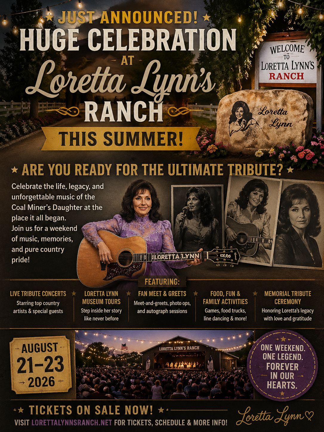 The news has just broken, and for longtime fans of authentic country storytelling, it carries a weight that goes far beyond a simple summer event. A massive celebration is being prepared at the historic ranch of Loretta Lynn—a place that isn’t just land and buildings, but a living, breathing archive of American music history. And this summer, that ground will once again echo with the voices, memories, and melodies that defined generations.