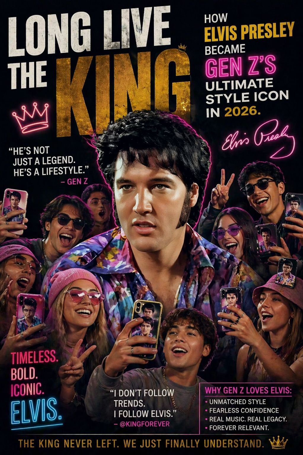In a cultural moment where trends rise and fall at lightning speed, something remarkable is happening in 2026: a powerful resurgence of interest in Elvis Presley. Not just among longtime fans who grew up with vinyl records and black-and-white television—but among the youngest generation shaping today’s digital world. The question is no longer whether Elvis is timeless. The real question is: why is Gen Z—a generation raised on streaming, social media, and algorithm-driven tastes—suddenly embracing the unmistakable style of a man who defined music decades before they were born?