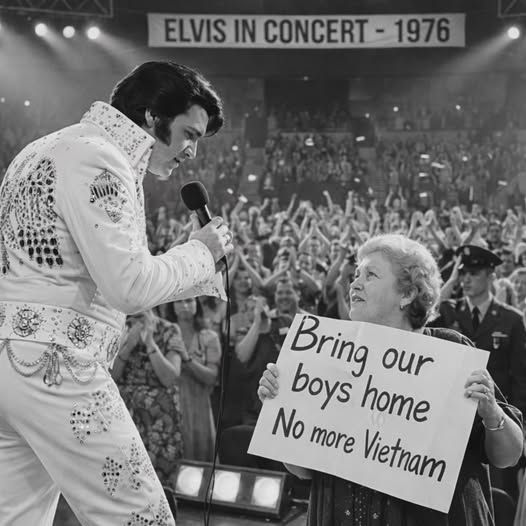 The band fell silent. Thousands of people froze. With a single raised hand, Elvis halted security. His voice, calm and steady, carried not command — but compassion. He spoke to her as a mother, not a protester. Her name was Catherine Morrison. Her son, Private David Morrison, had been missing in Vietnam for eight months.