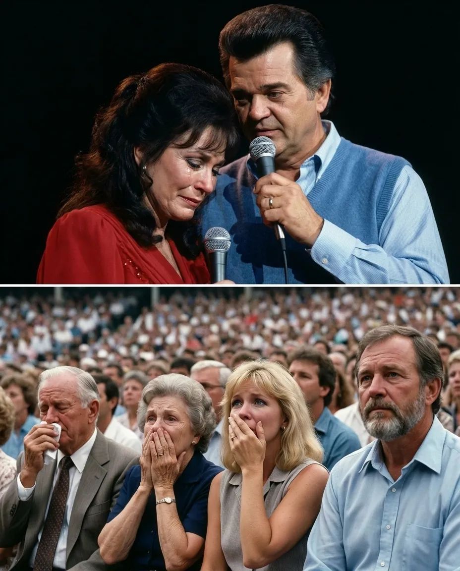 Beside her, Conway Twitty responded with quiet professionalism and deep respect. Without drawing attention to the moment, he gently continued singing, carrying the melody forward while giving his friend the time she needed to gather herself. The band followed his lead, and the audience waited in a rare silence that felt respectful rather than awkward.
