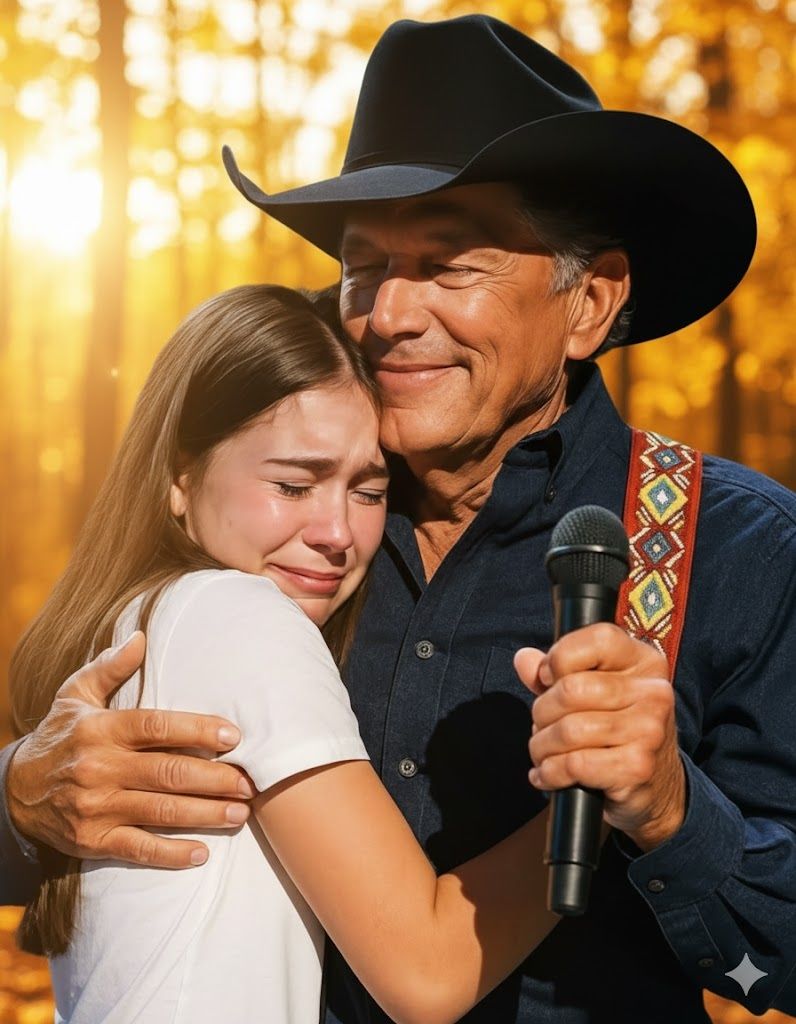 There, in the front row, was a small, hand-painted sign — simple, almost fragile, yet powerful enough to stop the show. Its words carried twenty years of waiting: “AFTER 20 YEARS… A PROMISE WHISPERED TO A CHILD CAME TRUE.” George Strait’s eyes locked onto it, and everything else — the lights, the cheering, the ocean of faces — seemed to disappear. What remained was a memory.