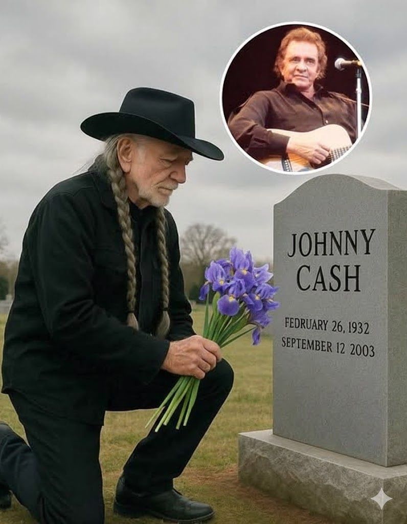 For decades, fans believed they knew the meaning behind that striking image: Willie Nelson kneeling before Johnny Cash’s resting place, head bowed, sunflower in hand, the wind circling softly around him. Most took it as a quiet moment of remembrance, a personal nod from one legend to another. But those who lived closest to the heart of the old Nashville circles tell a different version — a deeper, more haunting one.