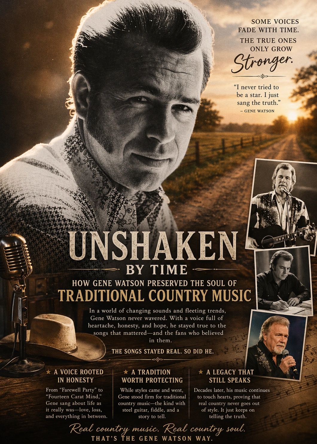 In a music industry constantly reshaped by trends, technology, and shifting audience tastes, there are only a few artists who choose not to follow the current—but instead stand firmly against it. Gene Watson is one of those rare figures. Unwavering conviction: Even as country music evolved with modern influences, Gene remained steadfast in preserving his traditional sound, choosing a solitary path to protect the very soul of the genre he has always believed in.