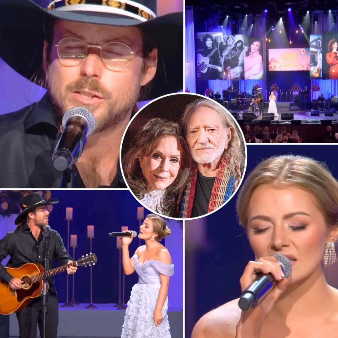 In that hush of remembrance, Emmy’s trembling hands held a guitar that had once belonged to Loretta herself. It wasn’t just an instrument — it was a lineage of sound, a vessel of memory. And beside her stood Lukas Nelson, son of Willie Nelson, carrying his own inheritance of melody and faith. Together, these two children of country royalty performed “Lay Me Down,” the only duet ever recorded by Loretta and Willie — a song of rest, faith, and reunion.