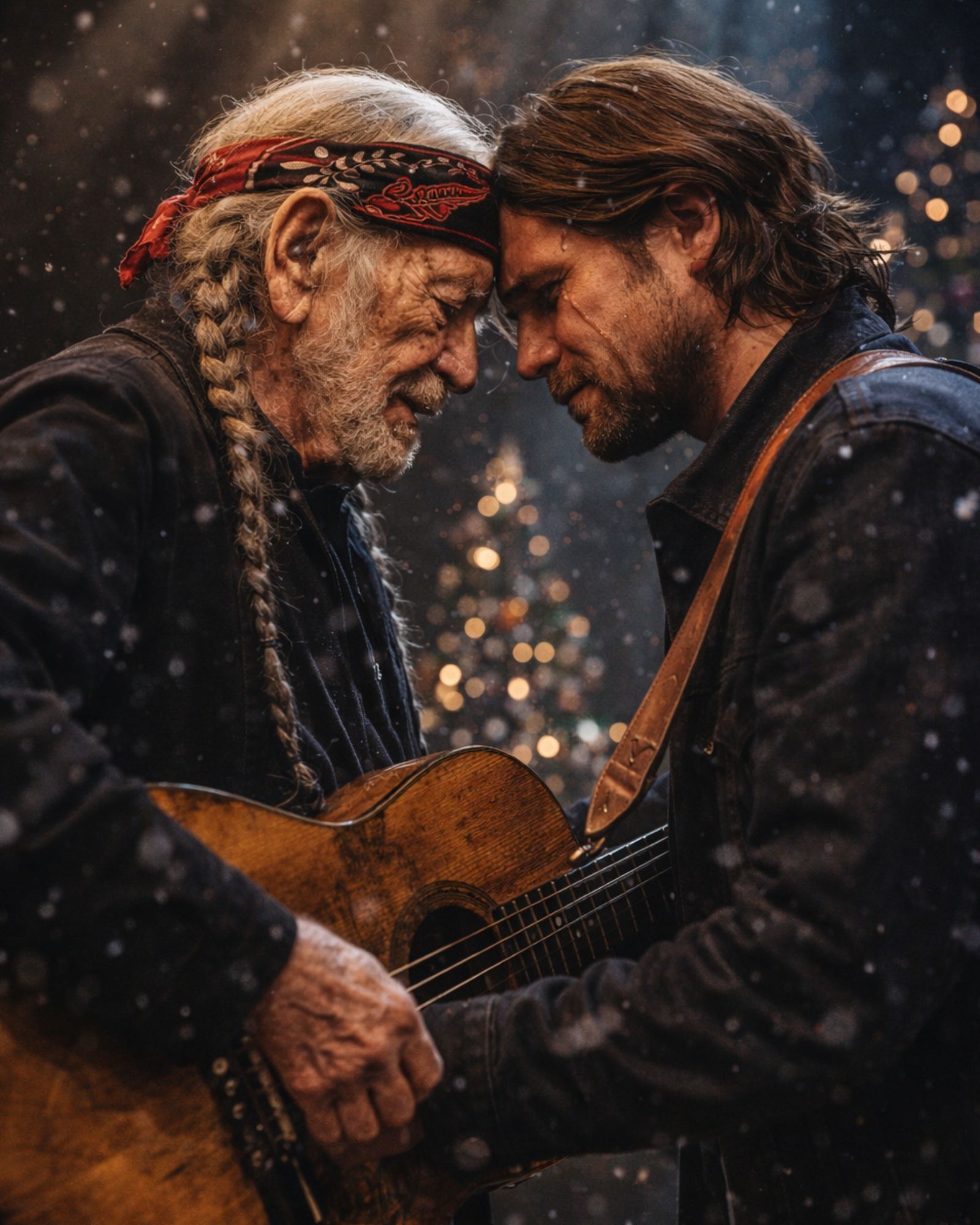 When Willie Nelson stepped forward that night, there was no dramatic announcement, no grand introduction. Just a familiar silhouette, an old guitar, and a voice that has carried generations through love, loss, rebellion, and faith. Beside him stood Lukas Nelson, not as a guest star, not as a supporting act, but as a son standing shoulder to shoulder with his father.